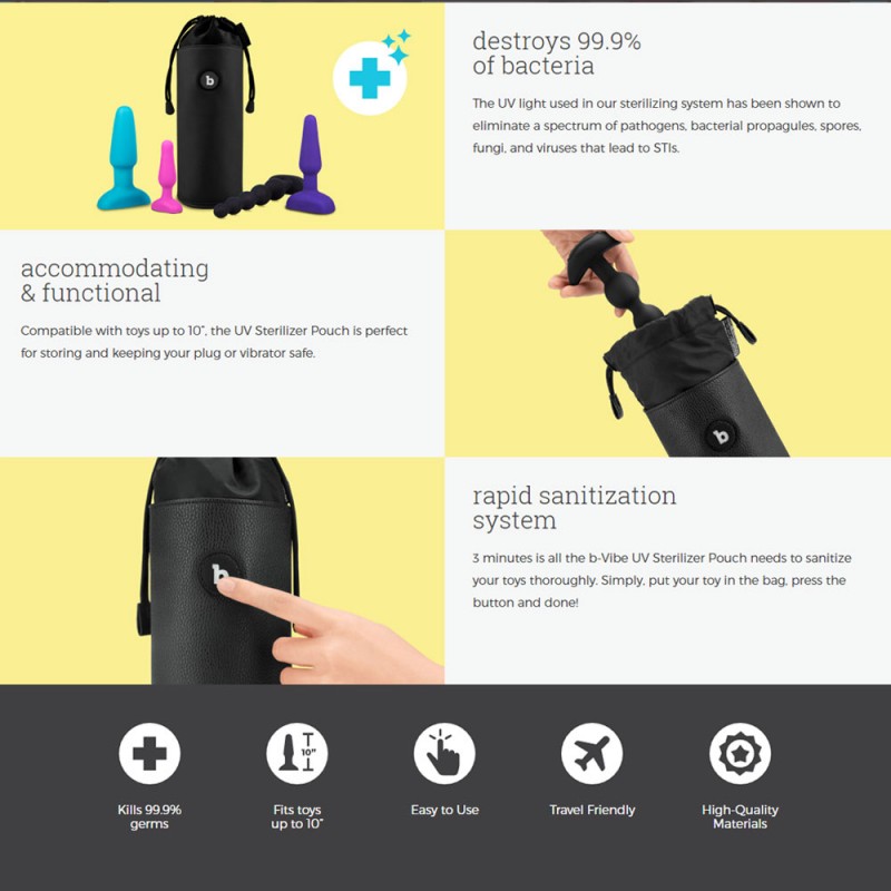 Keep your intimate toys clean and safe with the revolutionary b-Vibe UV Sterilizer Pouch. This innovative product combines practicality with high-tech sanitization methods, ensuring your sex toys remain in pristine condition, free from harmful bacteria and ready for use whenever the mood strikes.