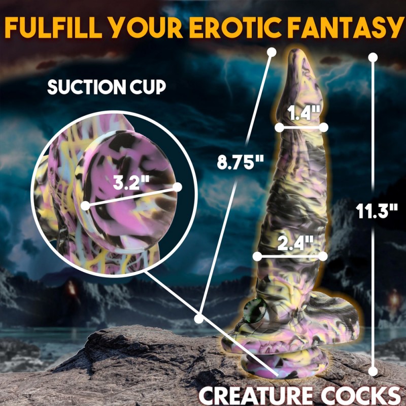 This Creature Cocks dildo comes from one of the many faraway lands of myth and fantasy. This yellow, pink and black rod has a tapered, textured shaft that is firm and flexible with a good amount of squish around the core so you push it deep into your sensual caverns. The serpentine-like body of this sexy shaft has a long, tapered head with ribbed shaft, popping veins, and an eye at the base. The vibrant green, glass cat-eye makes this Cyclops monster rod an intimate and mystical ride. Made out of premium, phthalate-free silicone it is body-safe and best used with water-based lubricants. The strong, suction-cup base allows you to enjoy hands-free rides when placed on any flat surface. It's also harness compatible so you can strap it to your partner or to a chair or bench. To wash it simply rinse in warm water and mild soap, then spray with a toy cleaner before letting it air dry.