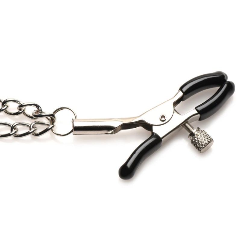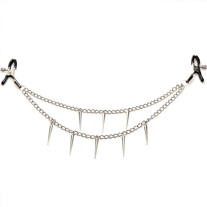 Constructed with a unique double chain design adorned with metal spikes, these clamps not only grip the sensitive nipples firmly but also exude a bold and beautiful appearance. The rubber tips are thoughtfully included to safeguard the delicate skin while offering an unforgettably pleasurable sensation. Adjusting pressure is simple, thanks to the easy-to-use screw mechanism. And worry not about allergens; all metal used is nickel-free.