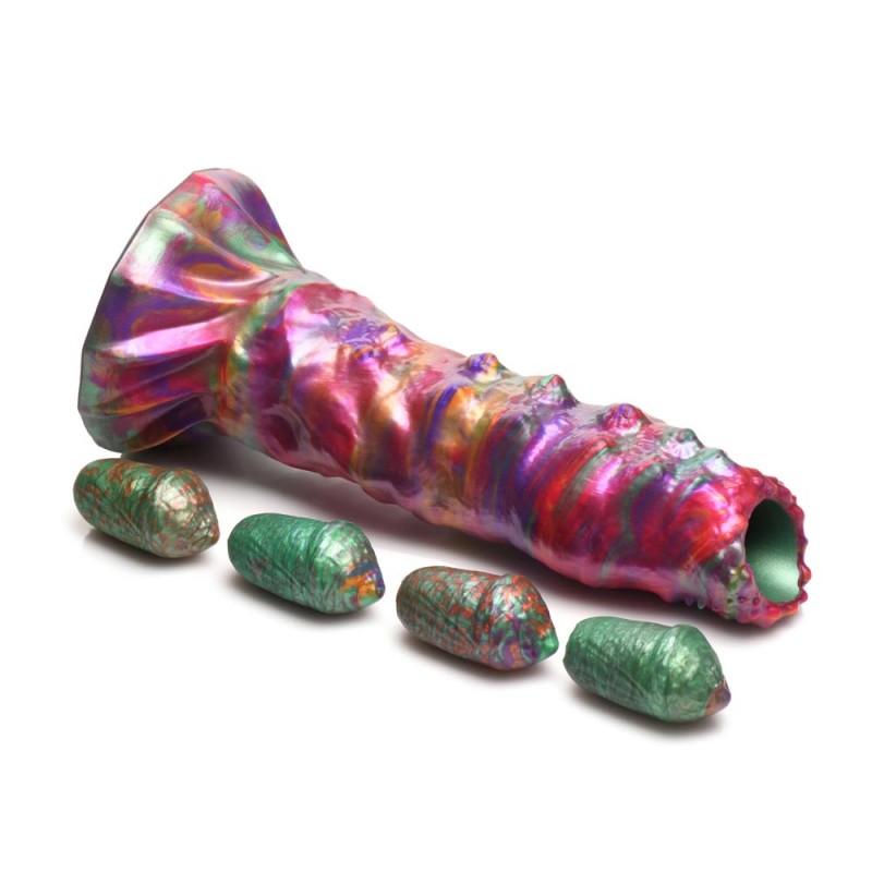 Delve into an extraordinary experience as you engage with unearthly visitors. This thick, textured Creature Cocks shaft offers a splash of vivid, iridescent hues, blending shades of pink, green, orange, and purple. The shaft's grand size is adorned with small bumps on the head, a ribbed texture on the other side, and a diverse mix of textures along the body down to its expansive, suction cup base. This alien shaft provides a hands-free experience thanks to its suction cup, or can be paired with a harness for thrilling strap-on or pegging adventures! Discover the unique pleasure of the four larva eggs which can be inserted into the hollow sheath and then into you, allowing the ovipositor to deposit them for later release! Constructed from pliable, ultra-soft, premium silicone, both the dildo and the eggs are phthalate-free, body-safe, and should be used with water-based lubricants only. To clean, simply rinse with warm water and mild soap, then spray with a toy cleaner before patting dry.
