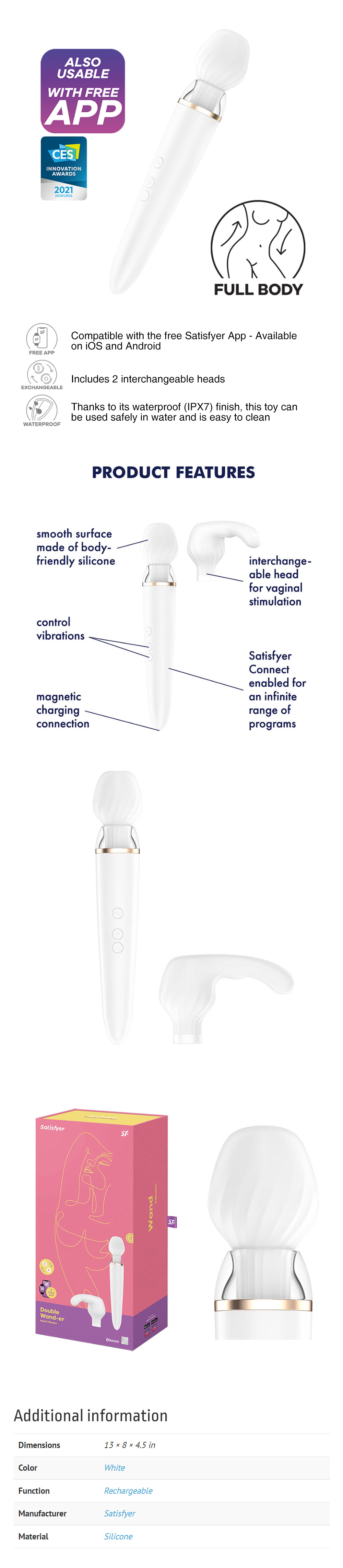 Satisfyer Double Wand-er Clitoris Stimulation Vibrator is meant to help you explore your body with confidence. Equipped with two interchangeable heads: a classic, round massage attachment as well as an attachment for stimulating the G-spot or A-spot Compat. The impressive XXL size makes it easy to use and easily reaches all the right spots and curves that long for relaxation and stimulation. The surface of the Satisfyer Double Wand-er is made of body-friendly, supple silicone, which bewitches your skin with a delicate feel. Because the massager is waterproof (IPX7), you can also use it in wet areas like the shower or bathtub and clean it easily with warm water and mild soap. The integrated batteries can be easily recharged with the included USB charging cable. With the Satisfyer Connect App, the Satisfyer Double Wand-er can not only be controlled remotely: You can also create your own vibration programs, have video and audio calls with your partner, or create vibration patterns based on surrounding sounds. The app is free and available for Android, iOS and Apple Watches.